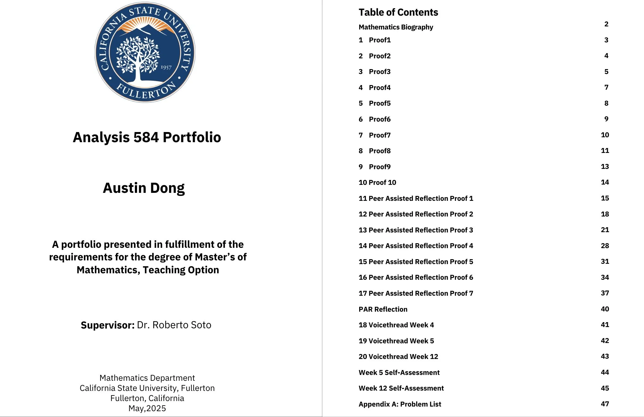 Over the course of the final term of my M.A. at CSUF, one of my classes was Real Analysis, which is where we essentially prove the foundations of Calculus. While we covered topics you generally learn early on in Calculus, the proofs we had to do were initially quite challenging for me because I was not used to continuously asking the question ‘why can I do/use this?’ in my math classes. However, I quickly got the hang of it and continued with the class pretty well. For the end of the term, we collected all of our proofs we did throughout the term and compiled them into one document showcasing our progression in proof writing, math understanding, and pedagogy.